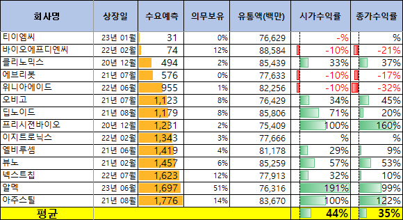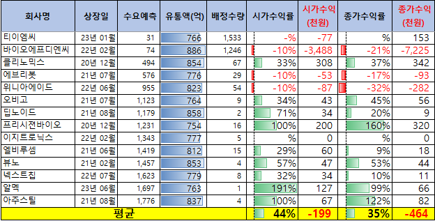 20년부터 23년6월까지 유통금액 800억대 공모주의 상장일 투자 수익률과 해당 종목을 5,000만원으로 청약했을 때 수익금액이 얼마나 되는지 알아보겠습니다.