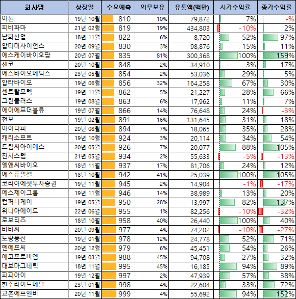 공모주 수요예측 결과에 따른 상장일 시가와 종가의 수익률을 보겠습니다.