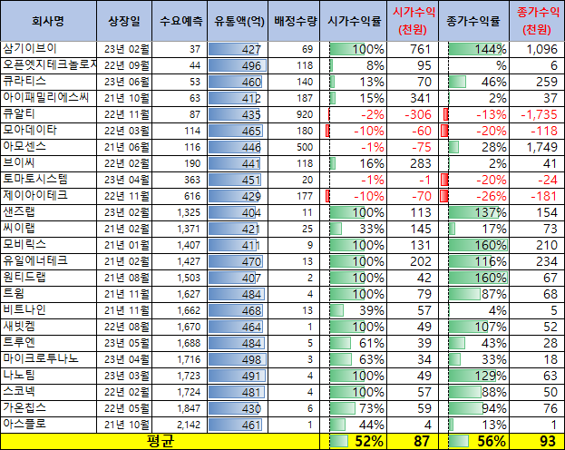 21년부터 23년6월까지 유통금액 400억~ 500억대 공모주의 상장일 투자 수익률과 해당 종목을 5,000만원으로 청약했을 때 수익금액이 얼마나 되는지 알아보겠습니다.